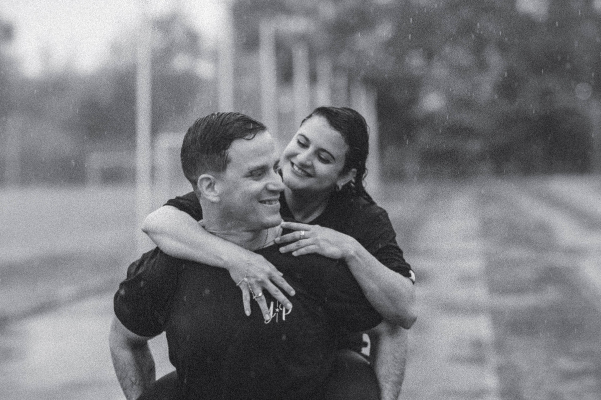Nada estava programado para ser molhado. O céu fechou e a chuva veio sem avisar. Muitos casais cancelariam, mas a Yane e o Paulo aceitaram o desafio com a mesma garra de quem encara uma maratona. O resultado? Um ensaio pre-wedding na chuva carregado de adrenalina, risadas e uma estética única que as fotos "com sol" jamais teriam.